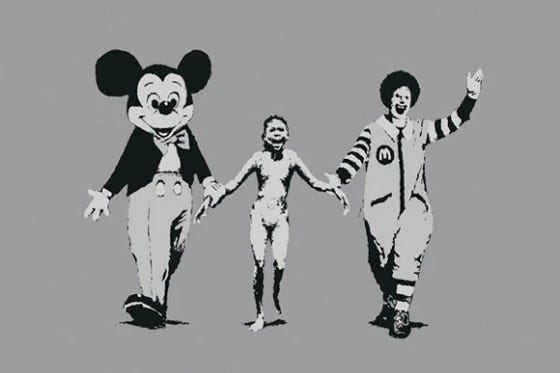 “Napalm” obra de Bansky basada en una foto de la guerra de Vietnam que critica a la cultura pop y su relación con el sufrimiento humano y la guerra.