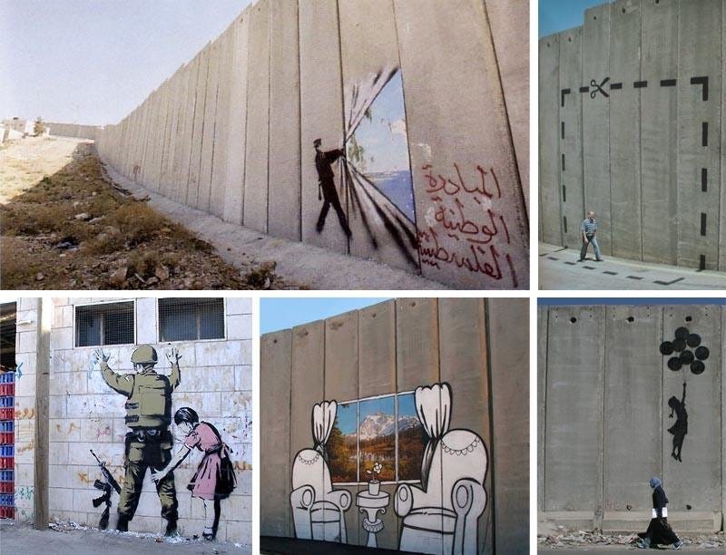 Otras obras de Bansky en el muro de Belén. Entre ellas: una niña cacheando a un militar y un militar abriendo una cortina que lleva a una playa de ensueño.