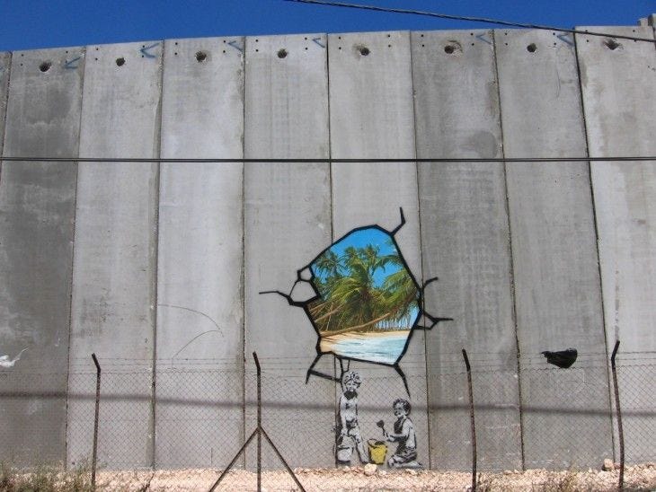 Dos niños jugando con la arena soñando con una playa paradisíaca en un contexto de guerra. Obra de Bansky.